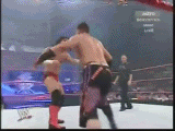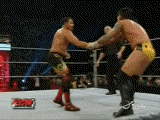 Mysterio vira suas atenções para Guty, mas sem ele perceber Guty vem correndo e faz um belissimo LEAP FROG HEADSISSORS TAKEDOWN que leva Mysterio na posiçao para um...619